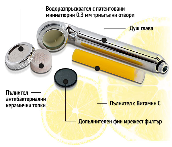 Уникален антиоксидантен спа душ с пълнител с витамин C (Це), който премахва хлора във водата, с която се къпете, добавя витамин C, генерира хиляди аниони, повишава налягането и пести вода.